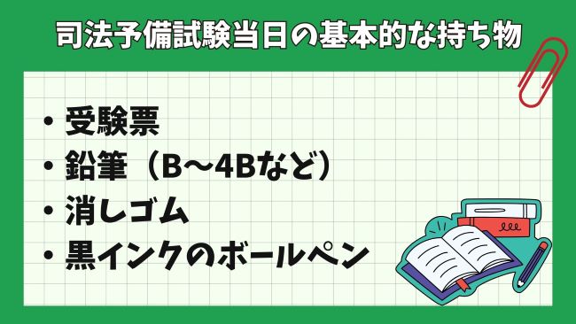 司法試験予備試験では筆記用具を忘れた場合に借りることができない可能性が高いため、必ず持っていくようにしましょう。