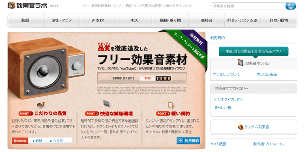 効果音ラボは、日本のYouTube動画やテレビ番組、ゲーム制作でも多く活用している国内最強の効果音配布サイトです。