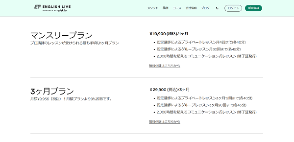プレミアムプラン 6,480円(税込) ライトプラン 5,450円(税込) ファミリープラン 1,980円(税込) オプション:ネイティブ受け放題 9,800円(税込) |
